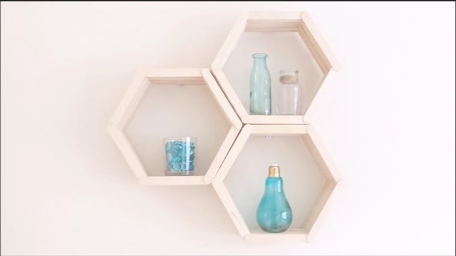 Ambil beberapa stik es krim. Susunlah menjadi bentuk segi enam. Tempelkan antar-ujung menggunakan lem. Buatlah tumpukan berbentuk segi enam tersebut sebanyak 10 tumpuk. Jika sudah membentuk satu segi enam dengan ketebalan 10 tumpuk tadi, buat bangun sejenis sebanyak 4 buah. Selanjutnya berilah warna masing-masing bangunan segi enam tersebut dengan cat berwarna cerah. Jika sudah mongering, rekatkan pada dinding.